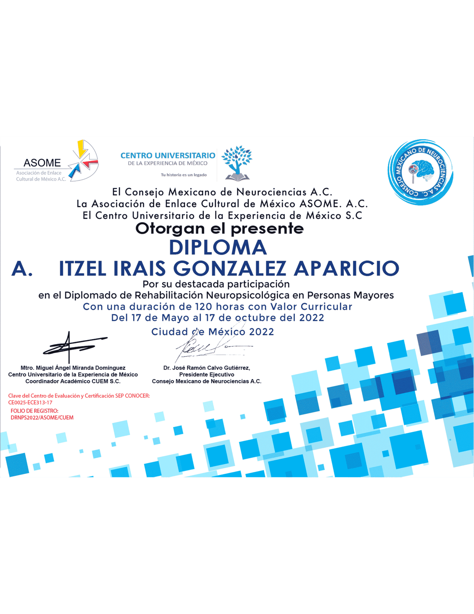 Estoy certificada por el Consejo Mexicano de Geriatría y cuento con una maestría en Ciencias Médicas por la UNAM, así como con un Máster en Neuropsicología Clínica y un Máster en Enfermedades Neurodegenerativas por la Universidad TECH de Madrid.