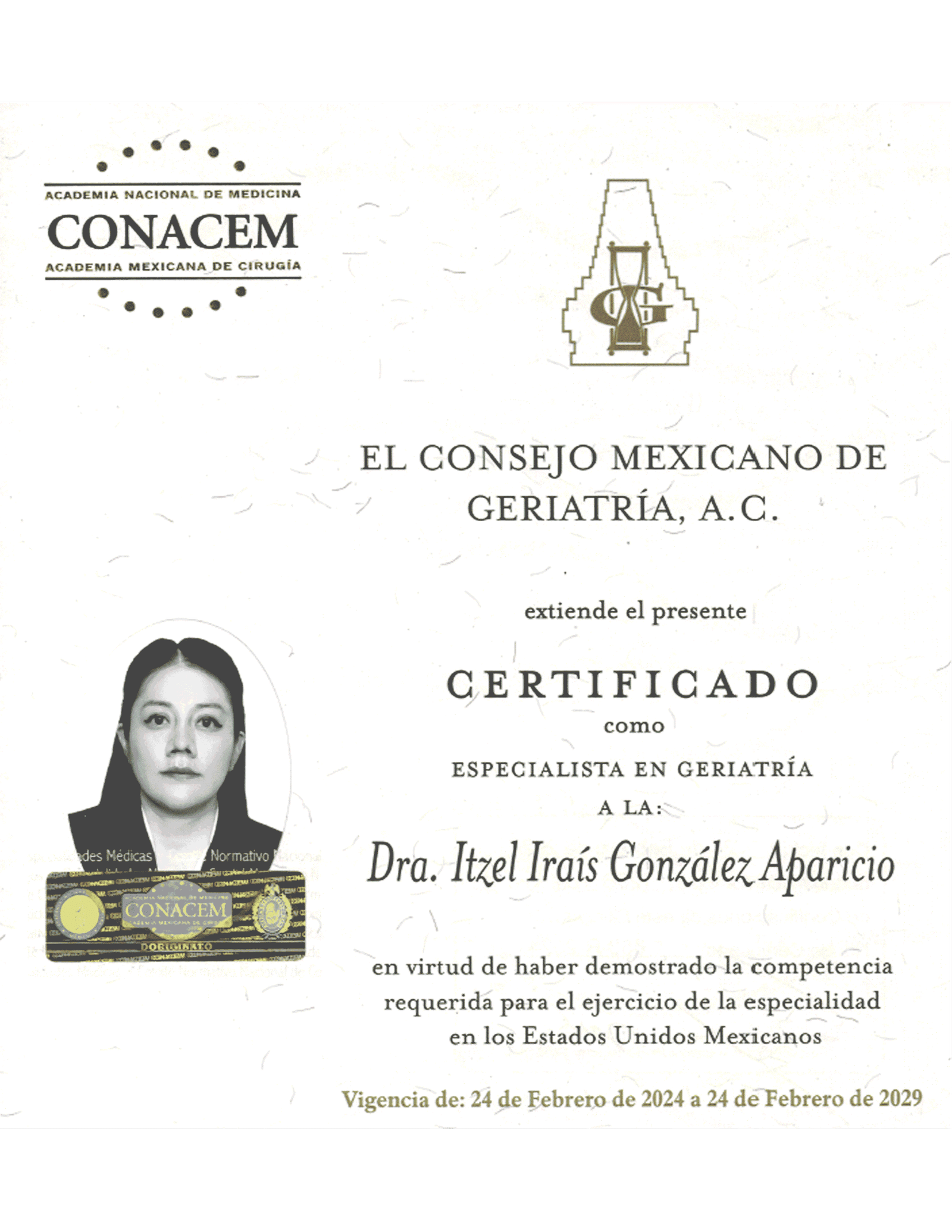 - Certificada por el Consejo Mexicano de Geriatría, A.C. Vigencia 2024-2029.