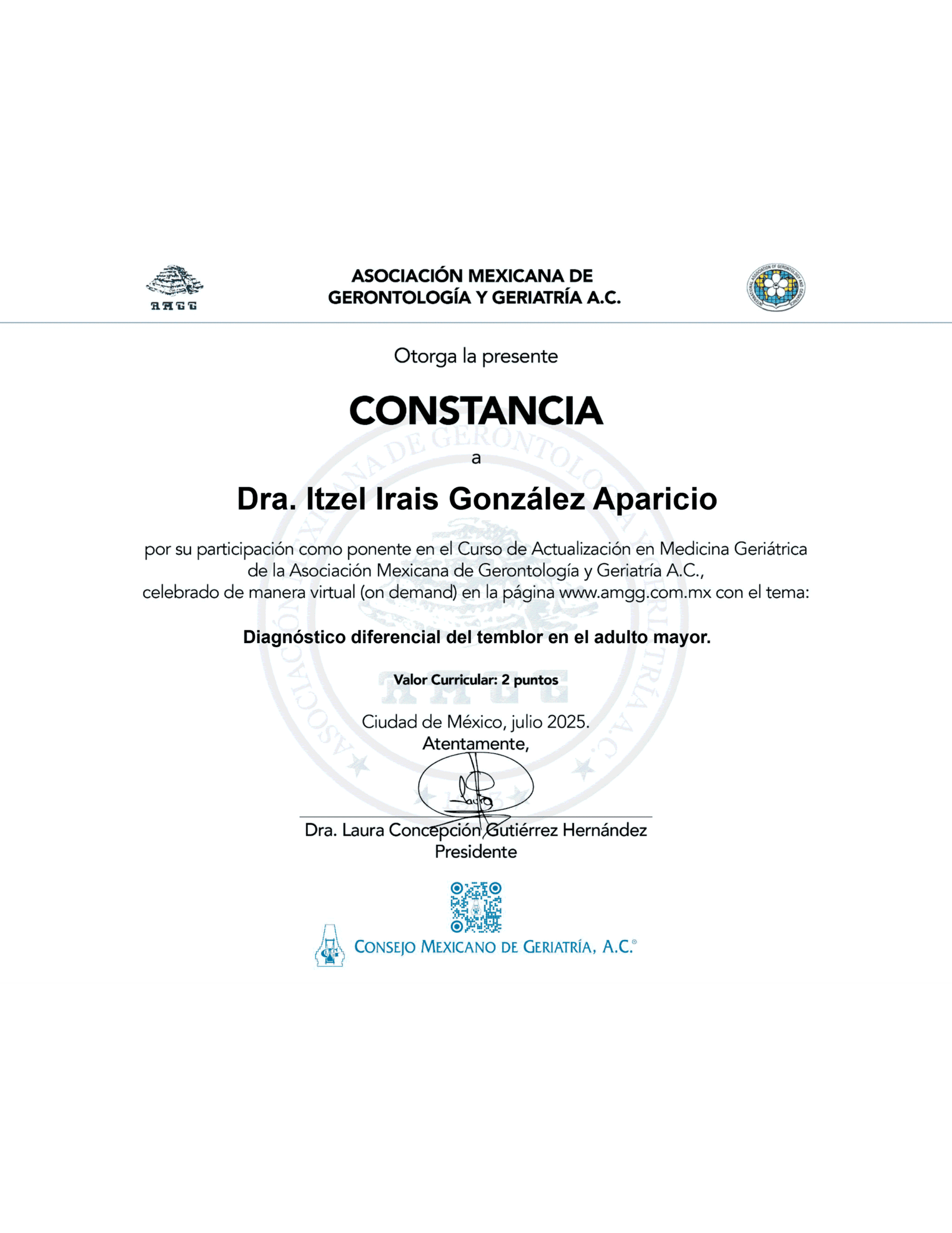 - Miembro de la Academia Mexicana de Geriatría desde febrero de 2024.